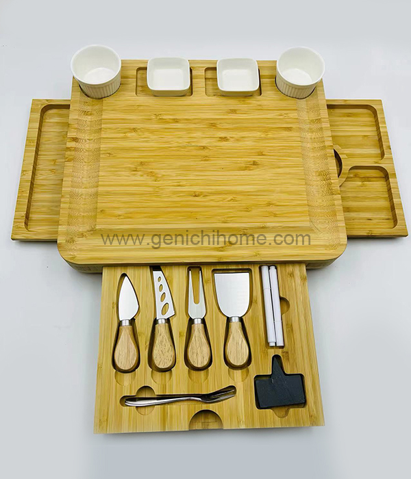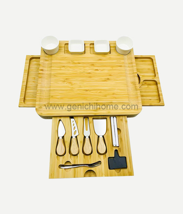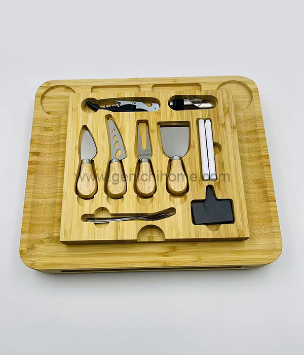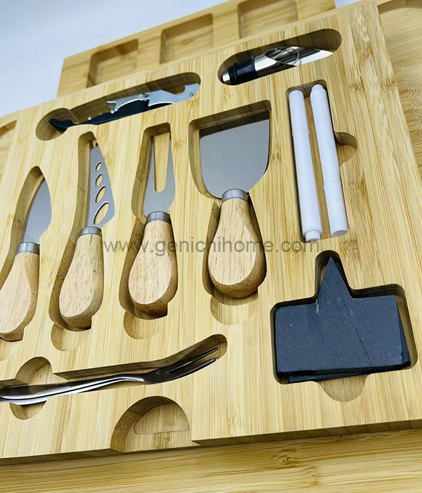 Forestil dig ubesværet med at skære gennem dine yndlingsost med vores osteknive i rustfrit stål, der spreder dem med vores chiske træostspredere og serverer dem med stil ved hjælp af vores slanke ostegafler - alle bekvemt gemt væk i Cheeseboards indbyggede skuffe. Med dette sæt vil du have alt hvad du har brug for lige ved hånden for at skabe en uforglemmelig ostesmagningsoplevelse for dig selv og dine gæster. Vi kan problemfrit aftrække dit logo på emballagen og skabe en personlig touch.